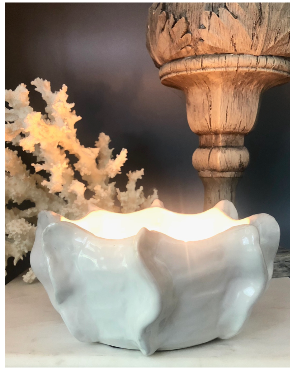 Blue and white chinoiserie collectors will fall in love with our porcelain lidded Foo Dog container. With a dainty handle on each side, it is 6.5" wide and 7" high, holds a 19 ounce two wick candle... the perfect accessory piece you will treasure forever.