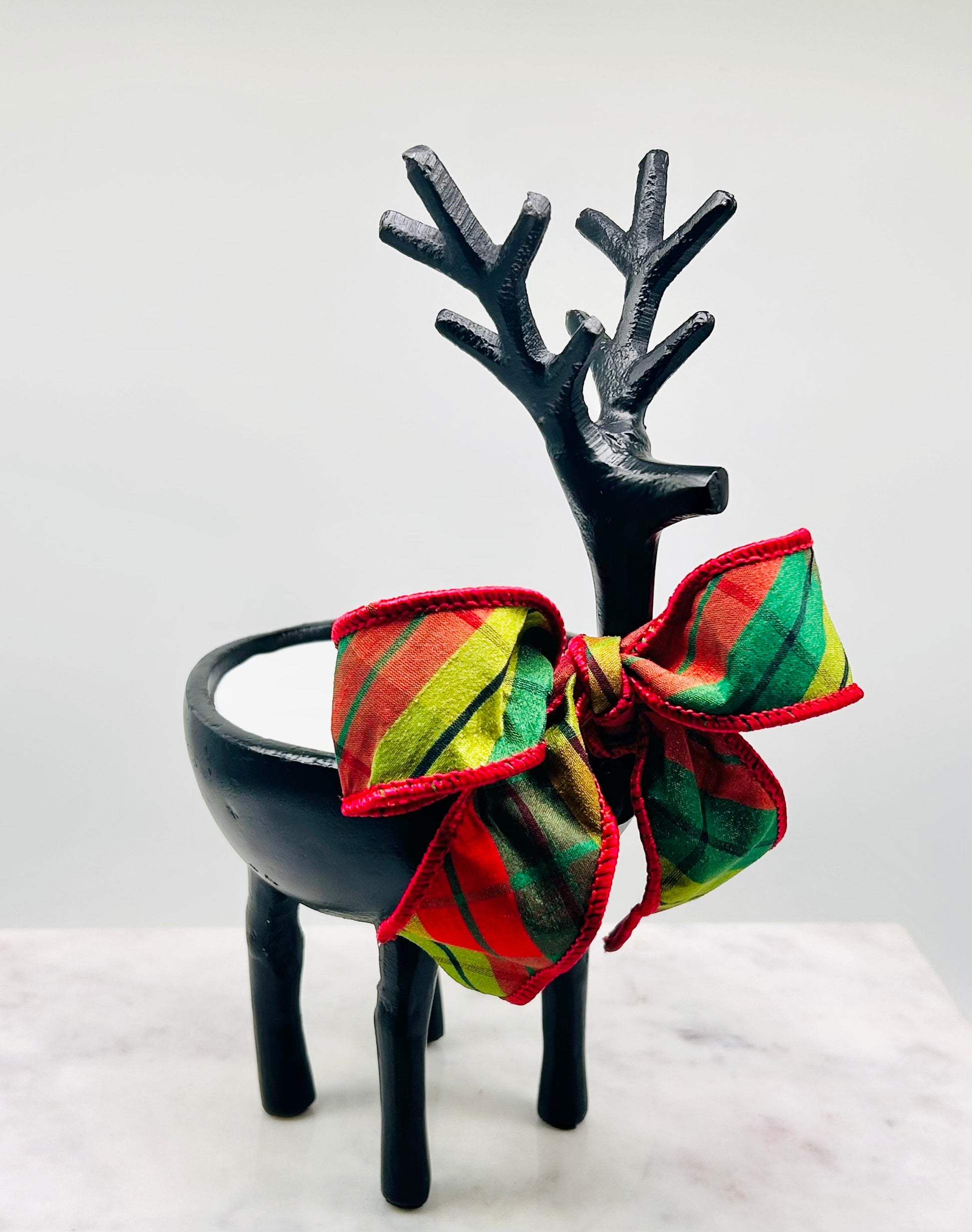 Our iron reindeer will make a playful addition to your holiday decor while holding a 10 ounce double-wicked Frasier Fir candle. A gorgeous wired silk Christmas plaid ribbon around his neck makes him festive and fancy for the season! Stands tall at 10 inches.