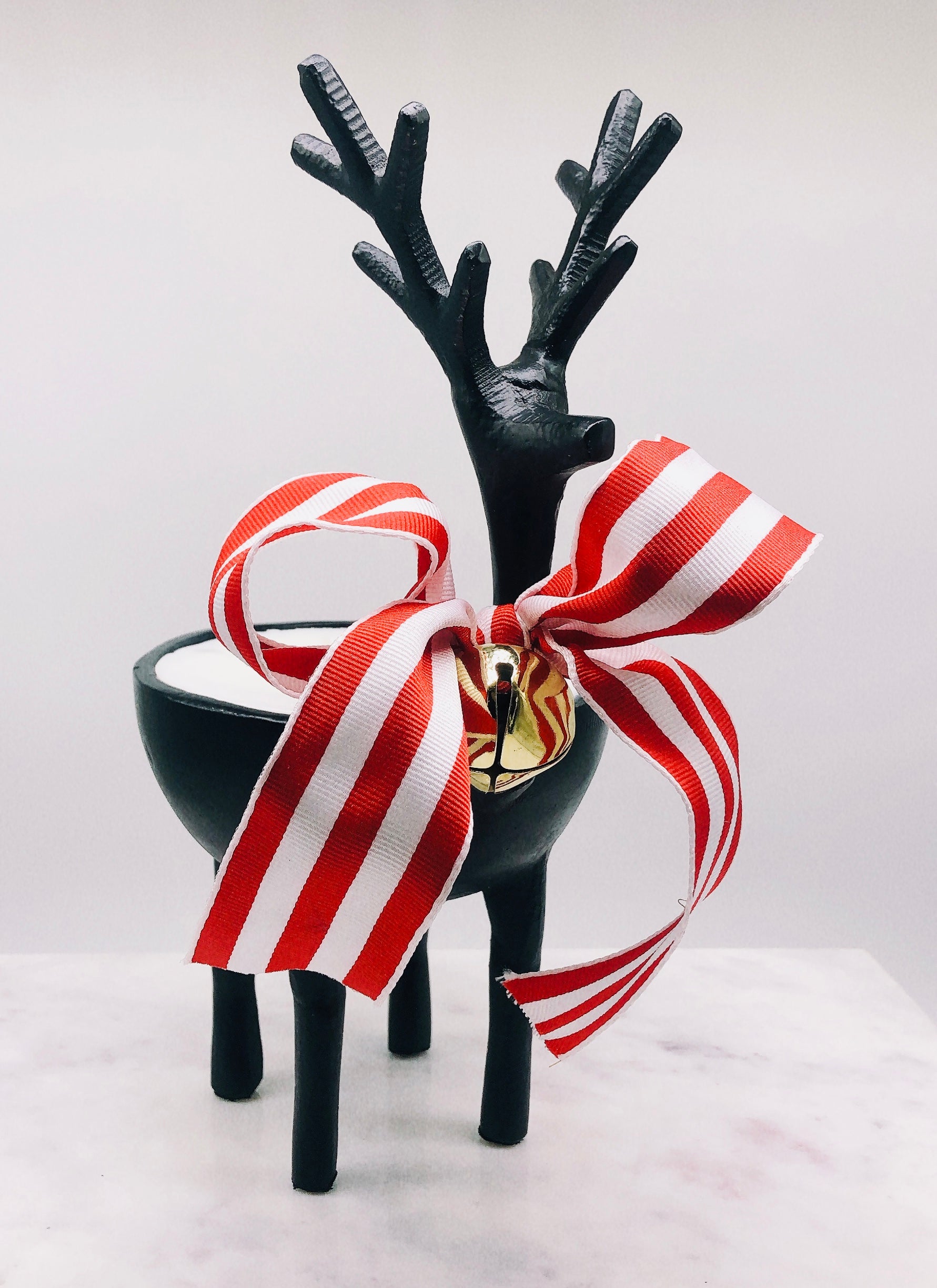 Our iron reindeer will make a playful addition to your holiday decor while holding a 10 ounce double-wicked Jingle Bells candle. A red and white striped wired ribbon and gold jingle bell, of course, around his neck makes him festive and fancy for the season! Stands tall at 10 inches.