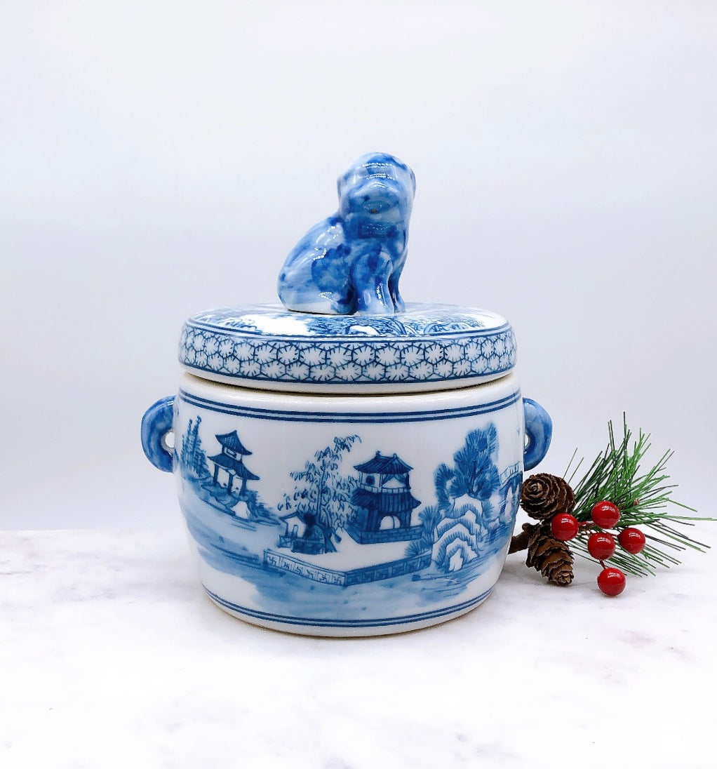 Blue and white chinoiserie collectors will fall in love with our porcelain lidded Foo Dog container. With a dainty handle on each side, it is 6.5" wide and 7" high, holds a 19 ounce two wick candle... the perfect accessory piece you will treasure forever.