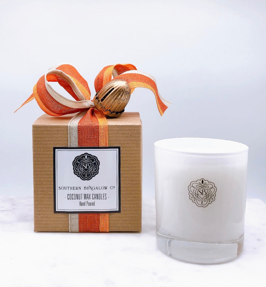 The Harvest and Orchard scents in our "Classic" jar makes a beautiful presentation in our fall wrapping complete with acorn bell.